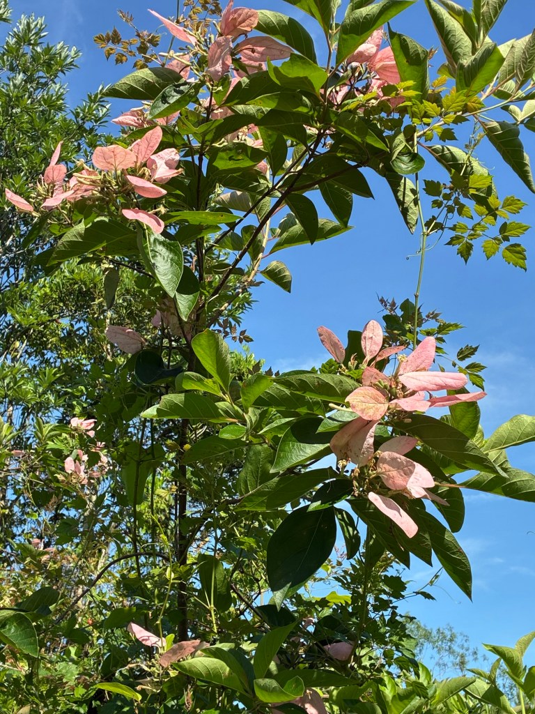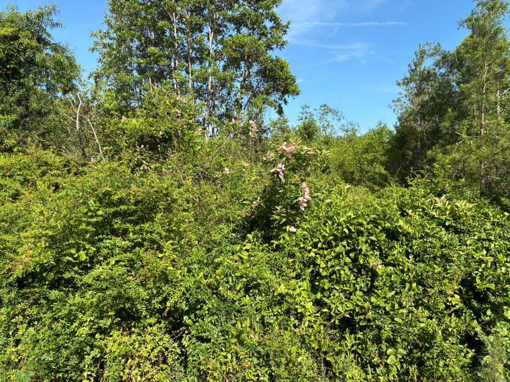 Back during my days at the South Carolina Botanical Garden while building the Natural Heritage Trail (native plants from mountains to sea of the Carolinas), the holy trinity of rare southeastern trees was Elliottia racemosa (Georgia Plume), Franklinia alatamaha (Franklin Tree), and Pinckneya pubens (Georgia Fever Tree). Fast forward to a co-worker recently showing me recent photographs of plants he saw on a bird expedition and I had him stop at the site of Pinckneya. He asked if it was Tung Oil Tree. Next day, I drove to the site and confirmed it as several examples of roadside Pinckneya on the Georgia / South Carolina border west of the Savannah River near Clyo. Unfortunately, the habitat seems degraded and perhaps the hydrology changed. The trees were nearly buried in peppervine, Smilax greenbriar and other opportunists. If it were not in riotous bloom, it would probably be invisible. But, on this day, the pink poinsettia-like flower dotted the landscape along the road.